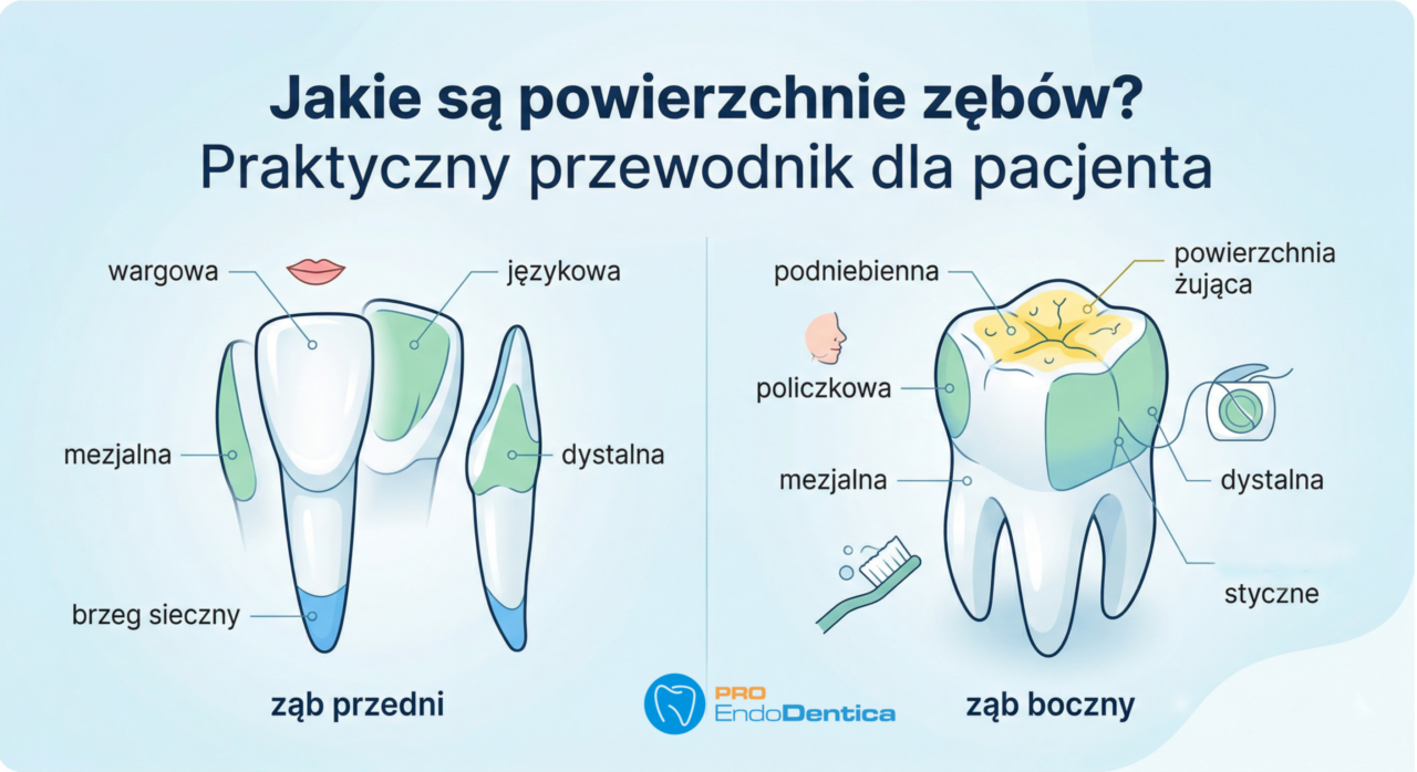 Jeśli zastanawiasz się, jakie są powierzchnie zębów, to odpowiedź jest bardzo praktyczna: to precyzyjne nazwy ścian i części zęba, które pomagają opisać lokalizację próchnicy, pęknięcia, starcia albo zakres wypełnienia. Dzięki temu dentysta może dokładnie zapisać, czy problem dotyczy powierzchni żującej, mezjalnej, dystalnej, wargowej, policzkowej, językowej czy podniebiennej. W tym wpisie wyjaśniam konkretnie, jakie są powierzchnie zębów, czym różnią się w zębach przednich i bocznych oraz dlaczego to nazewnictwo ma znaczenie nie tylko dla lekarza, ale też dla pacjenta.